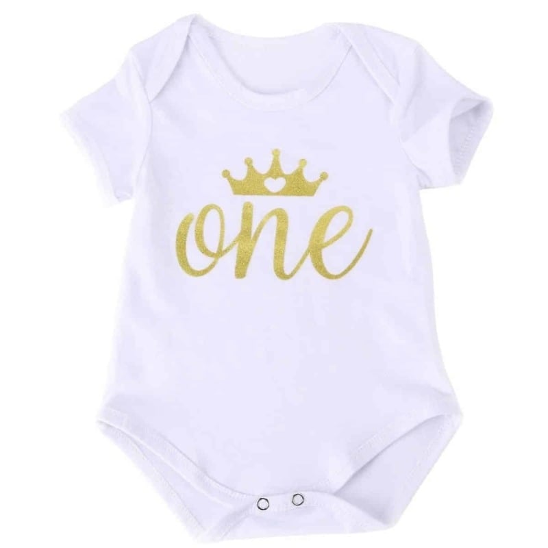 Remarkable summer and spring romper dress from new collection 2017 is just a click away. Divine white romper set with half sleeves shines bright with golden glittery “One” and crown printed on the bodice. Don’t miss on this baby bodysuit online which has designed with love and the most comfortable feel to keep your little one smiling. An amazing first birthday romper dress for baby girls and infants is what every mom desires to shop for her little love. Gift this cake smash outfit to your niece which will make her shine more on her special day. It fits on girls in age bracket of 0 months to 3 years.