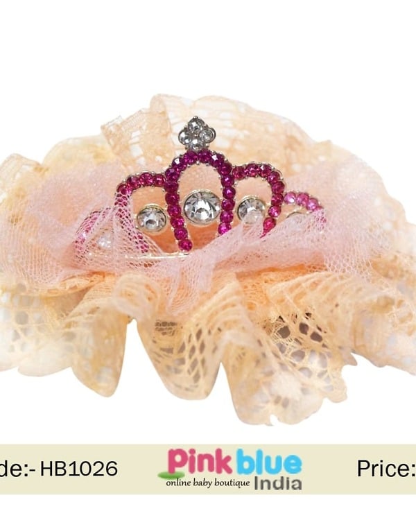 Shimmery Pink Diamond Crown on Designer Net Hair Clip for Baby Princess
