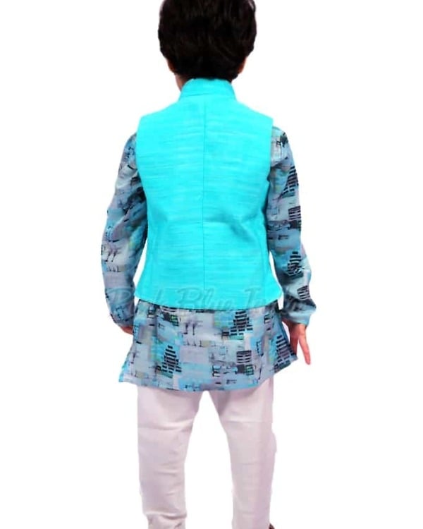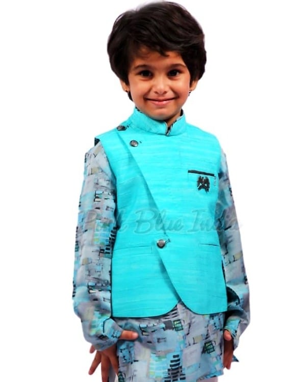 Redefine is style with this unique boy kurta pajama with jacket. Geometric kurta with a solid modi jacket in Sea blue with fashionable cuts comes with white pajamas to create an impeccable look for him for Diwali, weddings, sangeet and other special occasions. Buy online this fabulous kurta pajama for boys of age 4-5 years to add a wonderful ethnic touch to their personalities. Have this children’s kurta pyjama ordered from PinkBlueIndia for best prices.
