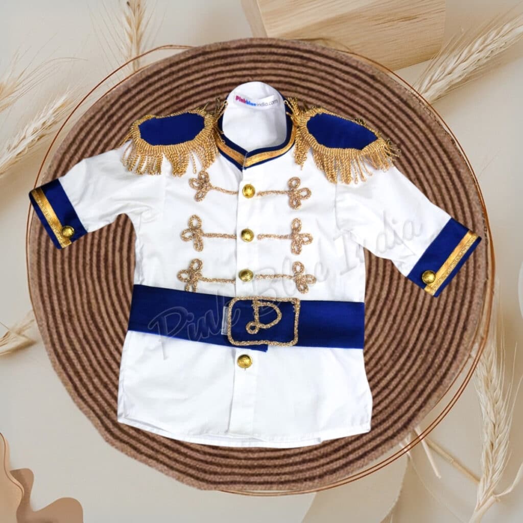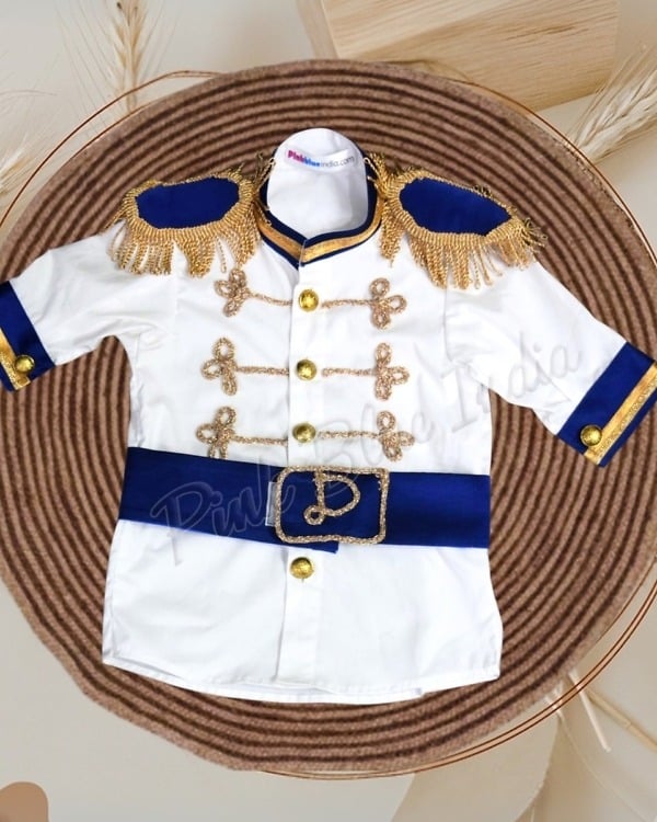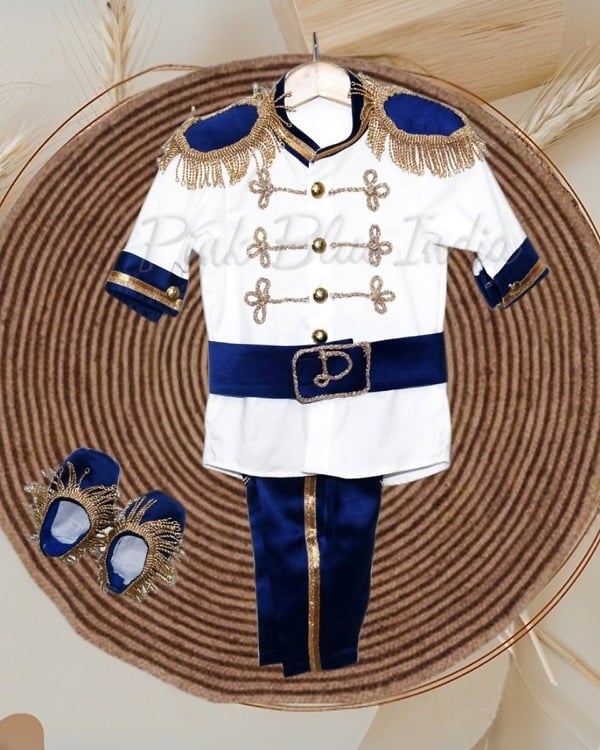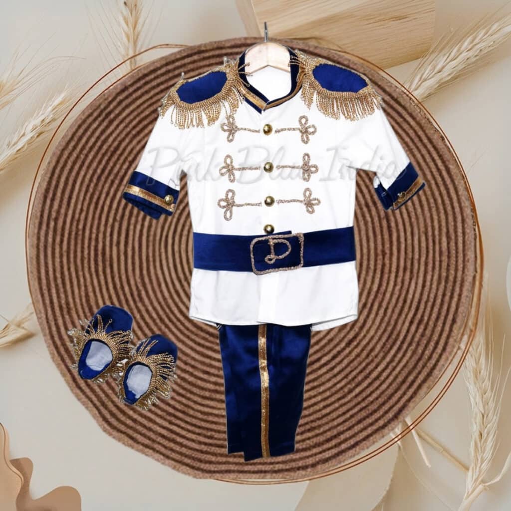 Add a royal touch to his birthday celebrations with the white and blue little king prince costume. Designed for 0-3 months to 12 years baby boys, this is an awesome royal prince First Birthday outfit made with cotton and satin. A perfect ensemble of pant and shirt, this is an incredible newborn baby dress which comes with belt and shoes with name initials. It can be customized with his name initials or colours of your choice. It even includes shoes but only for boys up to the age of one year. You can even have an exquisite father and son combo made super royal prince clothing with golden highlights.