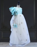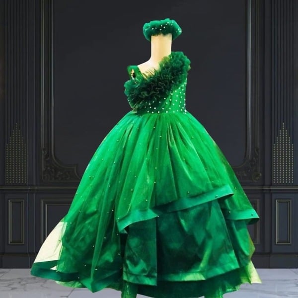 A beautiful satin and net designer kids long gown to shop online in India for girls between 1 to 12 years of age. Fashionable green princess cascade gown with bodice embellished with stones and detailed ruffle adds on to her style. Gift your little diva this baby girls cascade gown from the newest collection of party gowns for kids to dress her smart for Indian weddings, birthdays and any other special event and also find a matching hair band for a complete party look.
