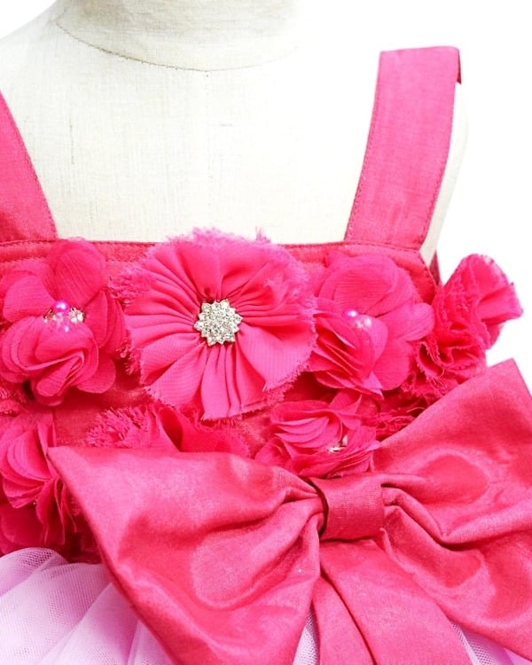 A three layered pink flower birthday dress for girl in different shades of pink. The yoke has a breath-taking arrangement of flowers with an oversized bow to make sure it wins her all the attention. You can dress her in this designer wear which makes a perfect first birthday party frock. She will look ravishing wearing this adorable frock for weddings!!!