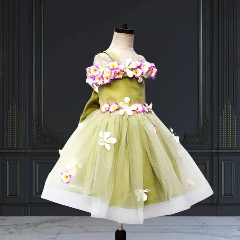 Fashionable off shoulder baby girl dress in olive green in a fresh pick. Garden of orchids set beautifully on the neckline with some on waist and flare make it a wonderful special occasion frock. The big bow on the back adds a classy touch to this fantastic dress. This dress comes with a white net flare.