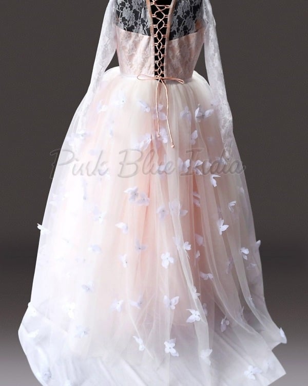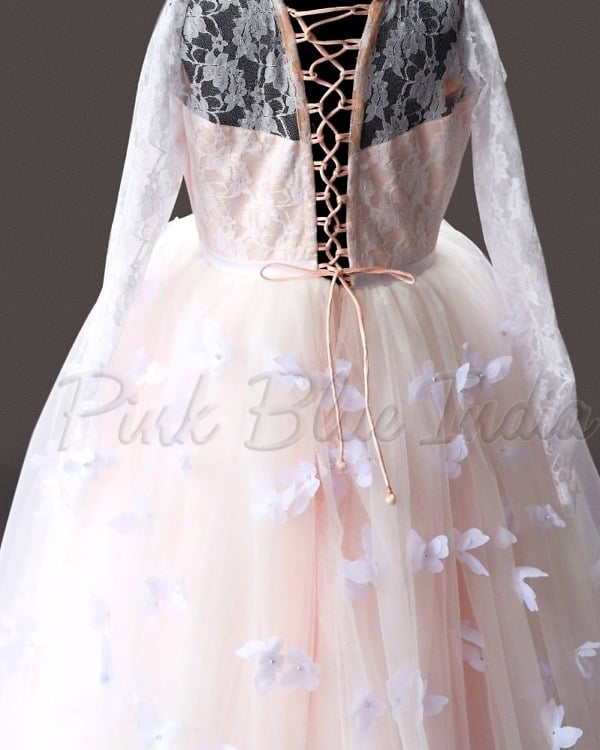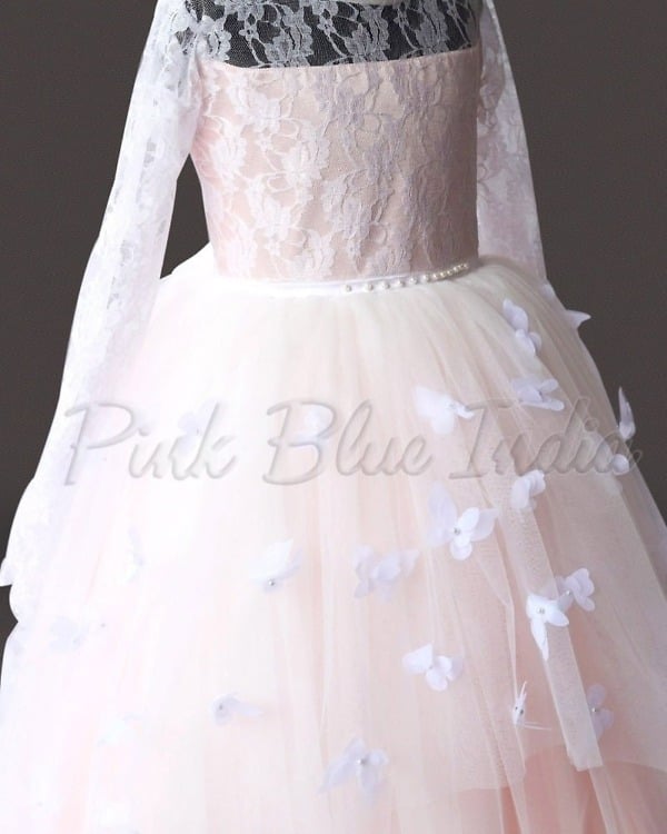 Bring out the best in her with this breath-taking gown in soothing light peach colour. This is a three-layered gown made with love and handmade butterflies scattered all over it. The bodice is made with self-design net and comes with impeccable fit. The flare is so fluffy that she will love it all the more. The beautiful crisscross design on the back makes it a must have for your daughter. Available in sizes for girls between 1 to 15 years of age, this is a lovely tulle gown for birthdays and weddings.