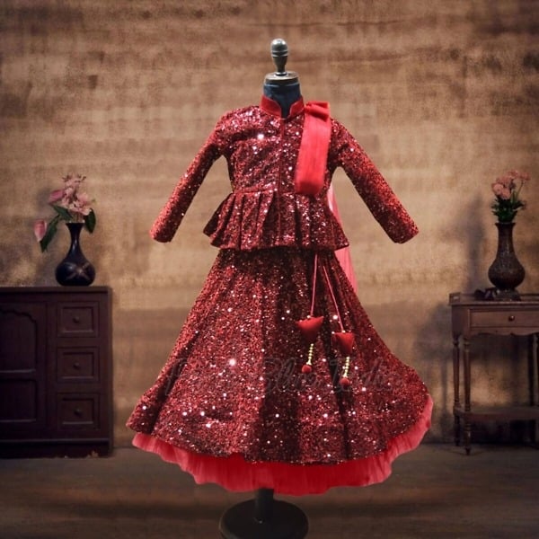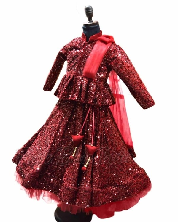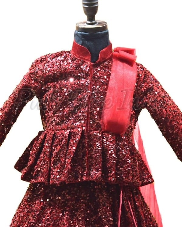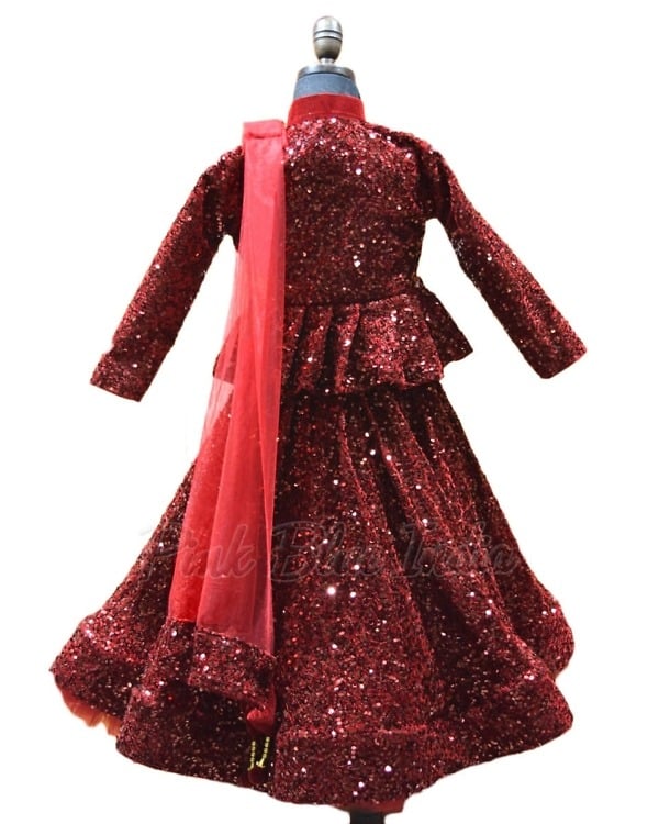Burgundy Velvet Lehenga Design Online for Baby Girls to Teenage Girl (1 to 16 years Kids). Perfect Lehenga Choli for Festival, Indian wedding, Rakhi and Diwali. Gorgeous baby girl velvet lehenga choli in burgundy colors makes an exceptional lehenga for girls to dress up for Indian weddings, Rakhi and Diwali. This velvet kids lehenga choli is a combination of peplum style choli attached with a dupatta and a beautiful skirt. Shop for this kids party lehenga online that sparkles to add more style to her personality. It is available in a wide range of sizes starting from 1 to 12 years.