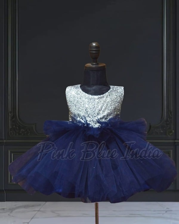 Have her shine bright and beautiful this this blue baby girls dress for baby girls between 1 to 12 years of age. This blue dress for baby girls comes with silver sleeveless bodice and blue net flare. Be it a wedding or birthday party, this party wear blue frock dress for baby girl makes an enthralling outfit. It even comes with a matching hair accessory to complete your little one’s look on her special occasion.