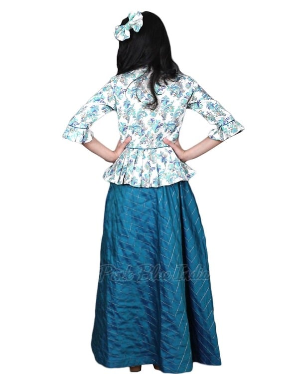 Be it a festival or a festive occasion, dress your little princess in this combination of kids peplum top with skirt. Made of cotton silk, it is an ensemble consisting of floral printed peplum top and green colored skirt. This girls ethnic wear makes an awesome Indo Western dress for girls of age group between 1-5 years to 10+ years. It even has beautiful tassels hanging on the side.