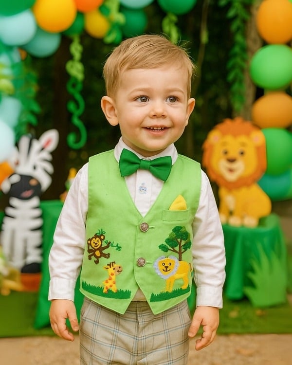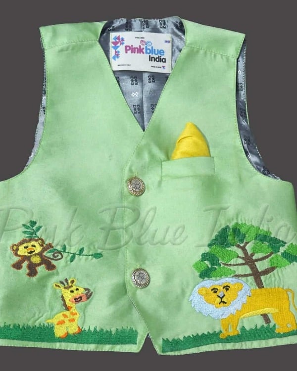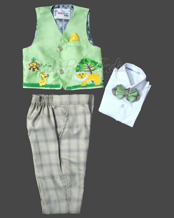 Make sure that you pick the right outfit for the jungle themed birthday party of your son with this Jungle themed outfit in green color. Made using silk fabric, it is a combination of jungle themed embroidered jacket paired with white shirt, green bowtie and grey pants in checks so that he looks nothing less than a gentleman for the birthday celebrations.