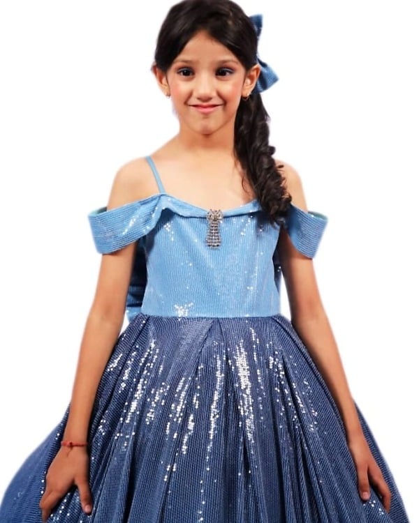 A fashionable first birthday dress to gift your baby. Off shoulder designer birthday party dress in blue ombre colour with sequins to add a subtle spark. This second birthday dress is designed for girls between 6 months and 15 years of age to make them look prettiest on their special day. There is a beautiful embellishment on the necklines and a lovely flare to add on to her look. Buy online this classy third birthday dress for your daughter to have her shine!!!