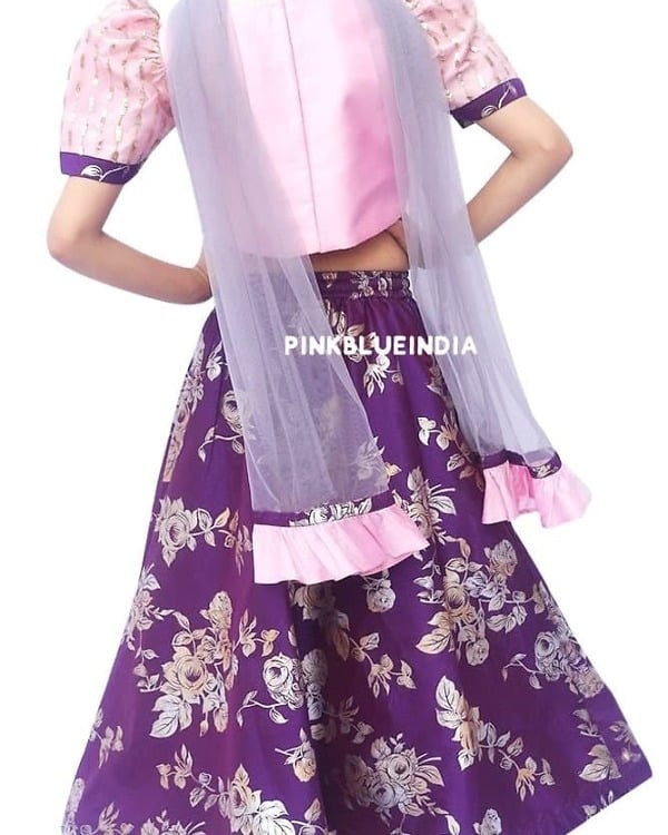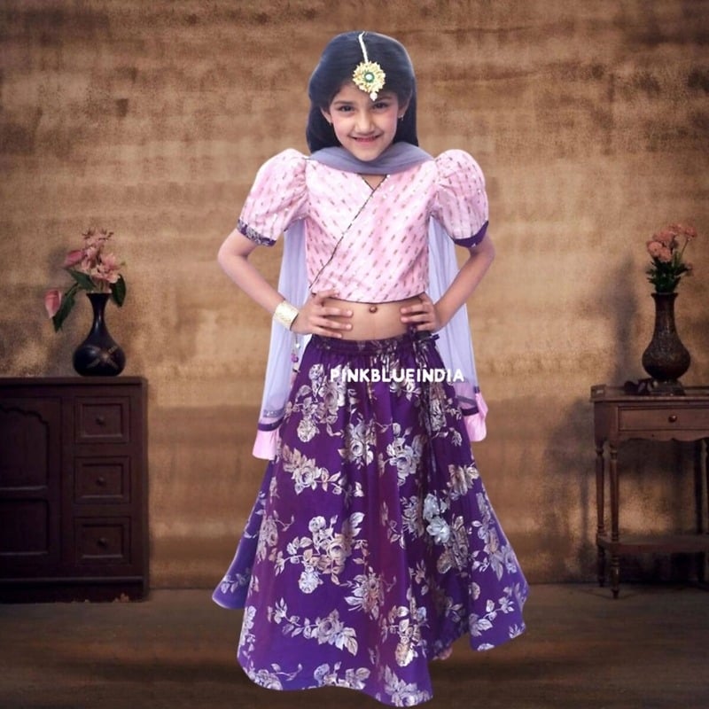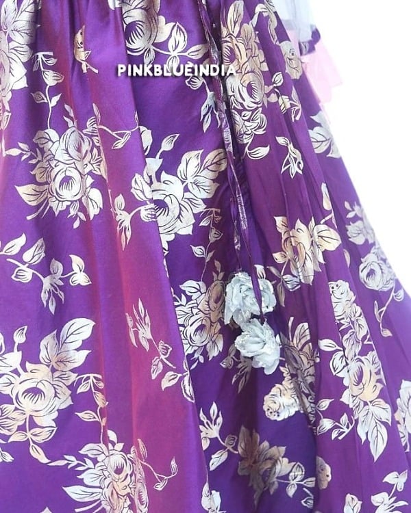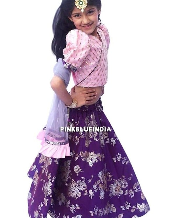 Let her win all the hearts with the prettiest baby lehenga dress in town. Purple coloured foil floral print lehenga comes with a smart pink sequins choli and complementing dupatta. The choli has puff sleeves and an overlap pattern with sparkling sequins work on it. Designed for baby girls between 4 to 7 years of age, this is a party wear lehenga for baby girl to give them a perfect look for weddings and festivals. Buy online this exquisite kids lehenga to let her flaunt her style fashionably.