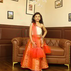 Orange banarasi one shoulder lehenga set with dupatta. A rich wedding outfit for girls, perfect for festive events and family celebrations.