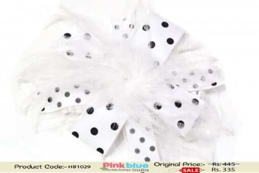 Buy online in India the exquisite and fashionable hair clip for your newborn princess. This cute white pin comes with white ribbon with black polka dots and feathers. Add this stylish and elegant hair accessory to the collection of your baby girl and dress her hair with style for a ravishing and exclusive party look.