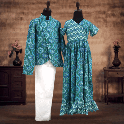 The blue colored sibling combo in cotton fabric makes a delightful wear on festive occasions and weddings. This matching sibling wear is a beautiful pick for Raksha Bandhan and other Indian festivities. It is a combination of a gown for sister and stylish short kurta pajama for brothers. Designed for kids in the age bracket of 0-6 months to 12 years, it makes a fantastic combination to shop at PinkBlueIndia.