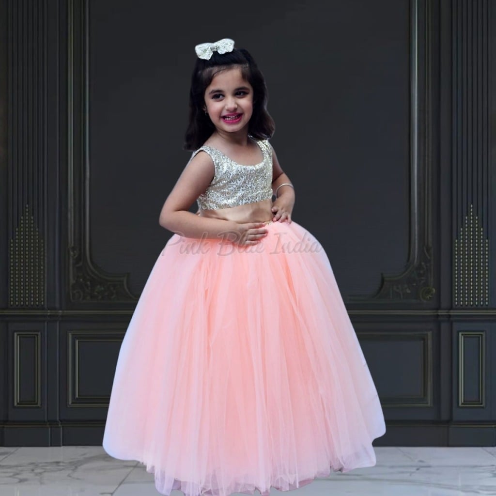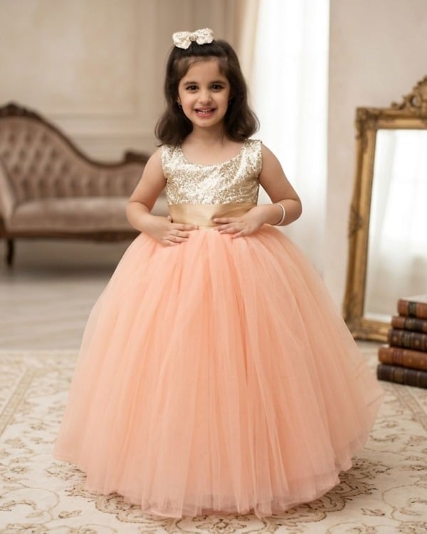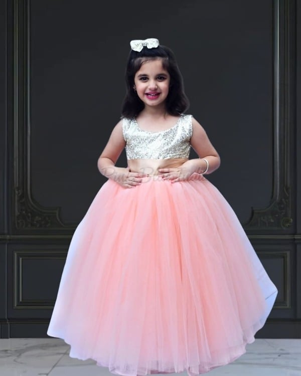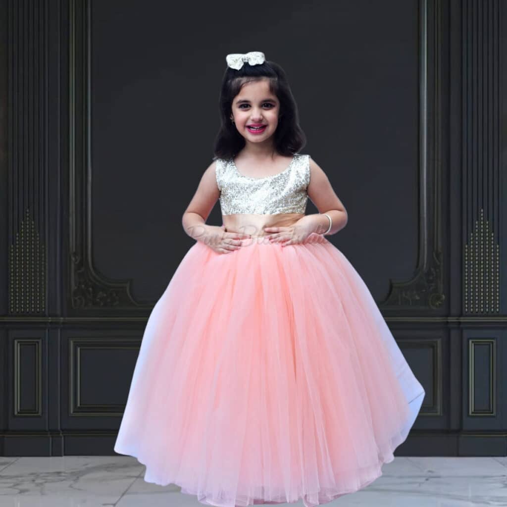 Have her shine beautiful in this classy birthday party wear gown with pale peach coloured flare and antique gold sequins bodice. This wonderful gown makes a pretty special occasion wear for birthday parties, weddings and even festivals. Dress your girls between 6 months to 12 years of age to have them dressed gorgeous in this elegant and stylish outfit made with love.