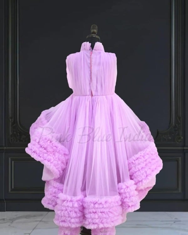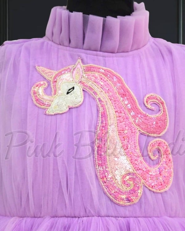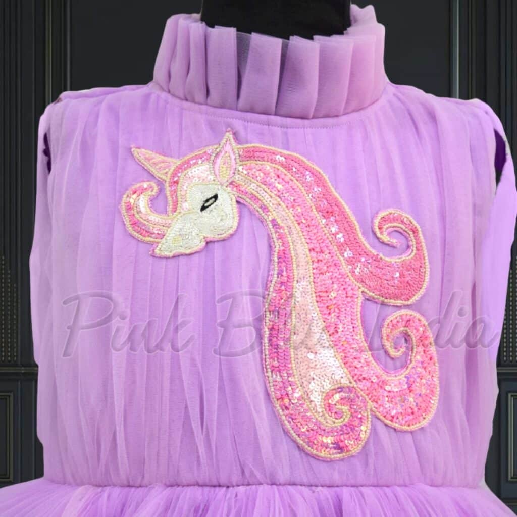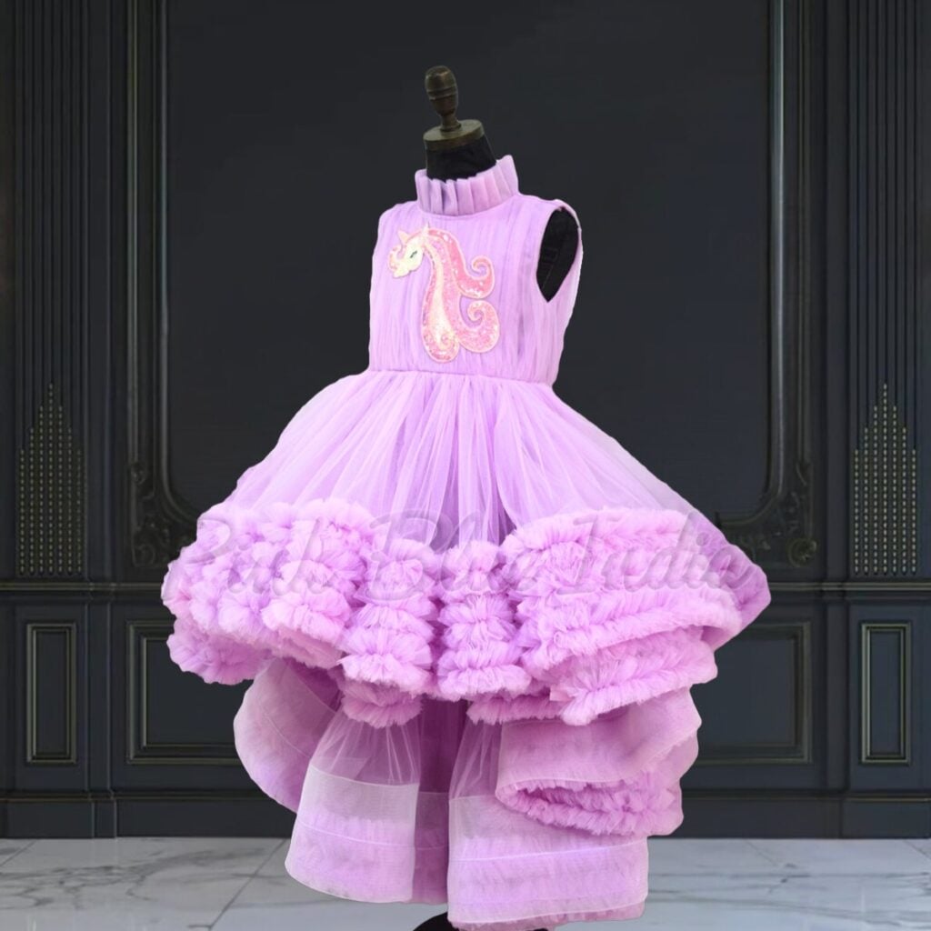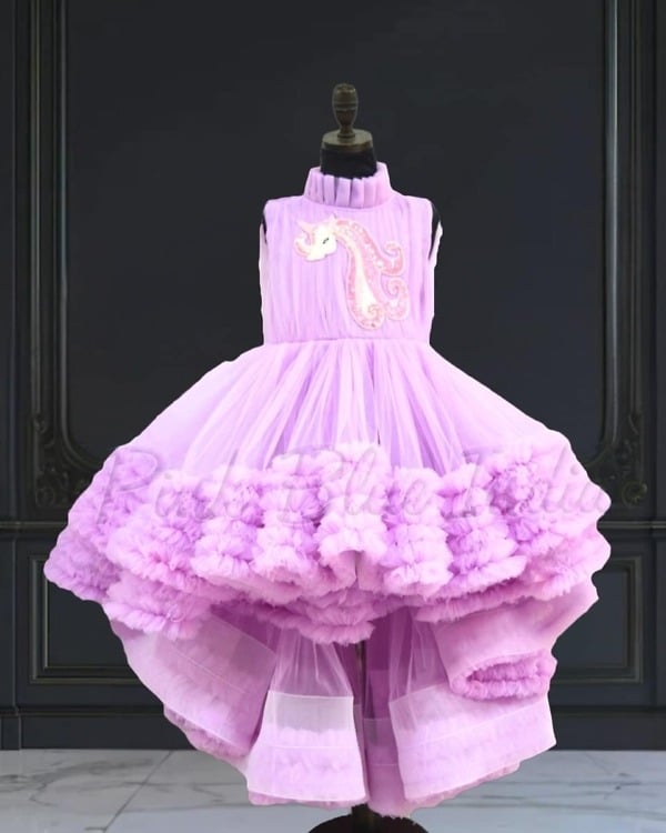 Unicorn hand embroidered high low gown in soothing lavender ruffled gown is perfect for your daughter’s unicorn theme Birthday party.