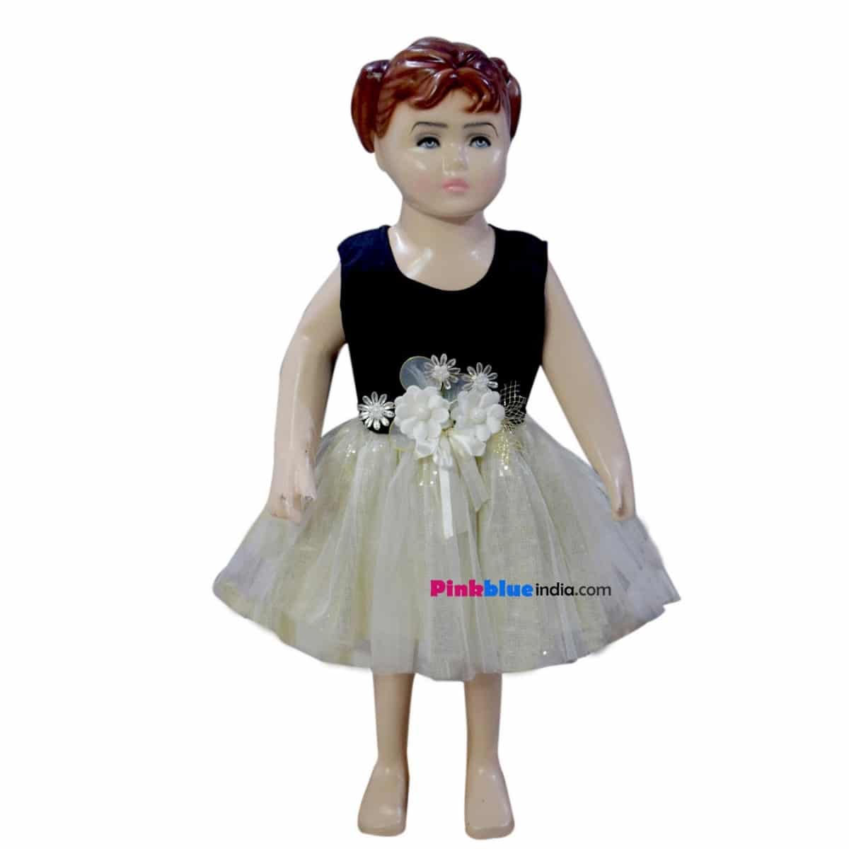 Shop online in India the beautiful and stylish infant dress for your young baby girl. The simple toddler dress comes with a sleeveless black bodice and an enticing net flare in white with lots of silver shimmer. The gorgeous floral setting on waist makes it a perfect birthday party and wedding attire. Dress your infant in this glamorous clothing.