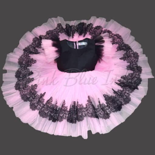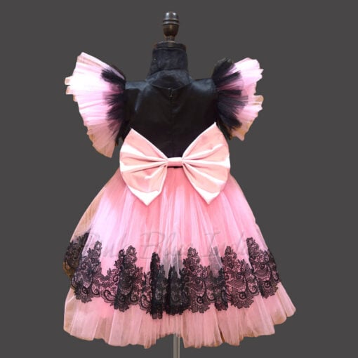 Buy online the pretty pink and black colored gown made in net for your little sweetheart. Designed for girls falling in between age bracket of 1 to 12 years, it makes an exclusive wear. Adorned with black lace, it makes a lovely gown to wear. It comes with stylish sleeves and it can also be customized as per your choice. This dress makes a fantastic wear to birthdays and parties.