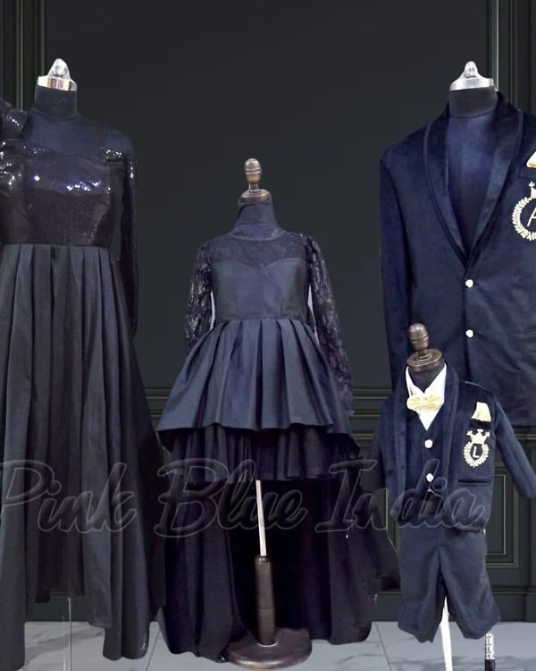 Looking for perfect family matching outfits for a family of 4? Your search ends here with these gorgeous outfits for your family that will elevate the whole look . The mother’s outfit is a high low gown with dramatic shoulder and sleeves pattern, while the daughter will have a classic high low pattern gown. The father’s Blazer is embellished with a personalised name initial and the son’s 5 piece tuxedo suit in velvet is made with precision.