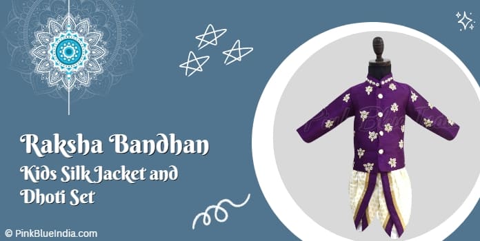 Silk Jacket and Dhoti Set makes an elegant Rakhi kids ethnic wear to dress up your little boys. He is going to win many hearts dressed with this traditional purple coloured Raksha Bandhan Silk Jacket and Dhoti for baby boy which makes an awesome clothing for festivals like these. Lovely kids Dhoti online which makes a delightful Indian ethnic dress to dress him for special occasions and festivities.