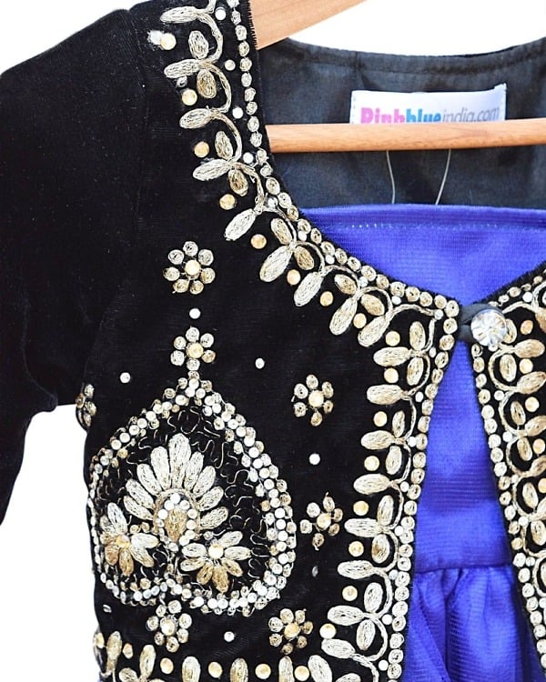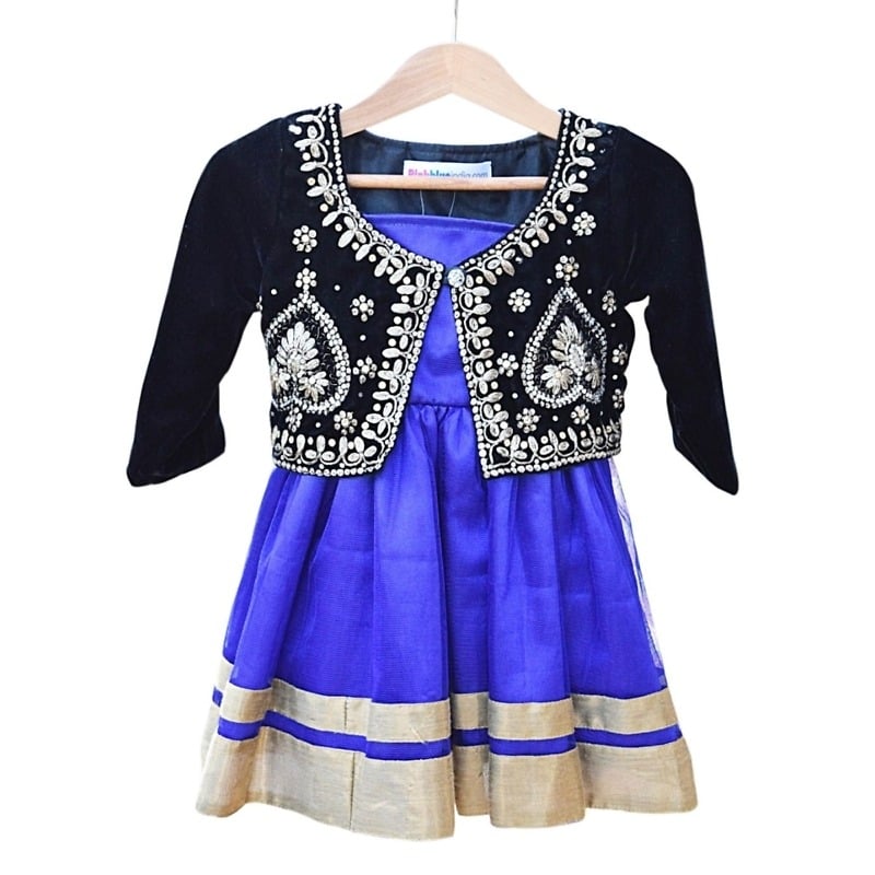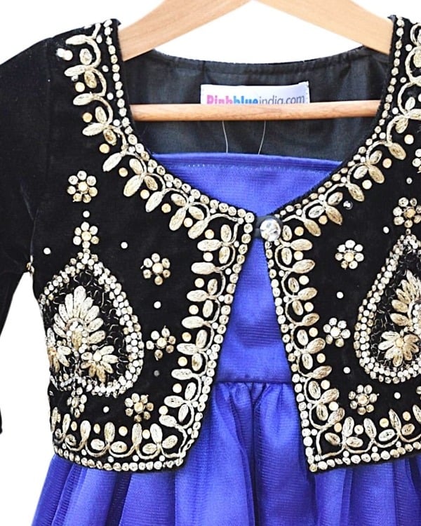 Dress your young girl in the fashionable traditional Indian children’s designer ethnic clothing. This beautiful Kasab work black jacket on blue frock is an ideal dress for Indian wedding. Have this customized luxury fashion apparel ordered for your girl to dress her up in an opulent ethnic dress for kids. Buy online in India this ravishing frock with a regal jacket.