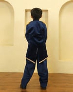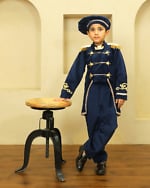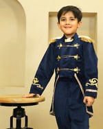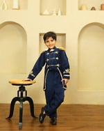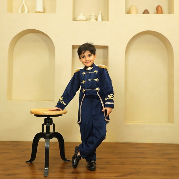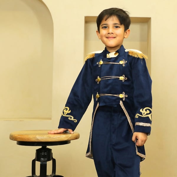 Blue velvet prince tail coat with matching trousers, ideal for theme birthdays and stage events. A premium handmade outfit for memorable celebrations.