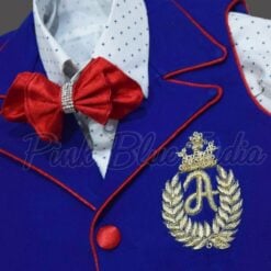 Have your baby boy dress up in this blue and white cotton boys waistcoat outfit for birthdays. This boys waistcoat suit is a five piece set of white shirt, blue pants, red shoes, red bow and blue jacket made in Raymond’s fabric with personalized name initials. Designed especially for baby boys of age 1 to 16 years, shop for this exclusive kids waistcoat online at PinkBlueIndia.