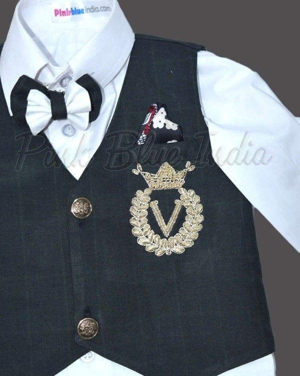 A delightful and classy 1st birthday party outfit for boys in charcoal green makes a fantastic waistcoat set for baby boys of age 1 to 16 years. It is a set of white shirt with charcoal green pants, shoes, bow and jacket made of Raymond’s fabric with name initials embroidered on it. Have him dressed in this unique 1st birthday party outfit for boys to dress him in great style.