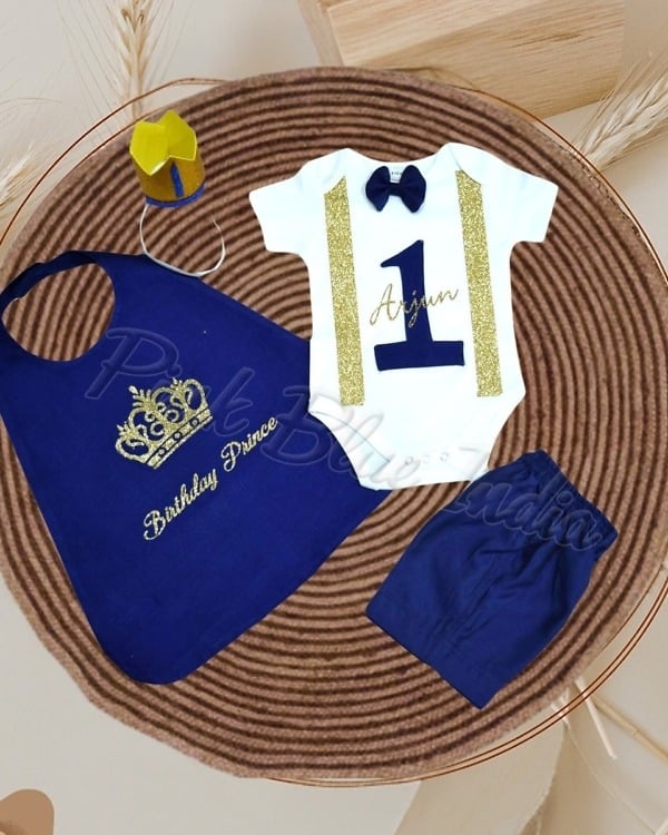 With this royal blue cake smash boys outfit, you can make his first birthdays so awesome. Buy online in India this cute onesie and cape set made with cotton and satin. Designed for baby boys between 0-3 and 12-18 months, this is a premium quality onesie with glitter printing birthday cape and crown which comes with the convenience of customization as you can have your little one’s name printed on it to get some fun clicks on his special day.