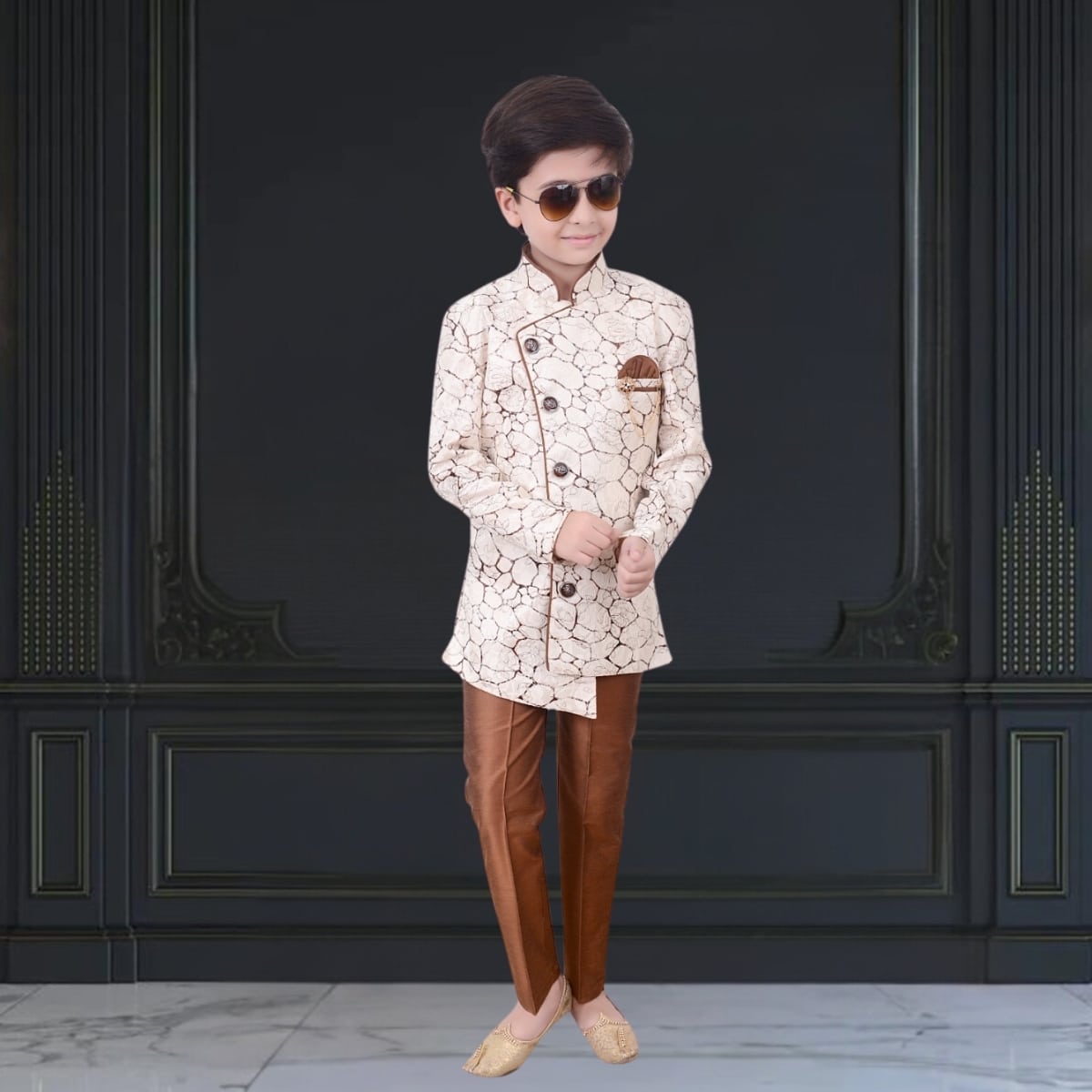 Royal Indo Western dress for baby boys in India. A stylish cream coloured jacket with trendy cuts has been paired with brown pants to craft an exclusive ethnic wear for kids. Buy online this charming Indo Western outfit for boy to refresh his look for parties, festivals and weddings this year. This enchanting traditional clothing is available for baby boys between 4 to 5 years of age.