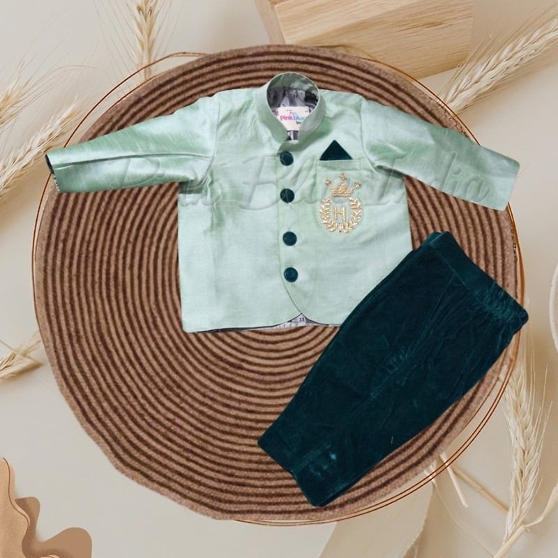 Give your baby boys between 1 to 12 years of age a stylish look for weddings and festivals with this unique pistachio green coloured Jodhpuri suit crafted in raw silk with personalized name initials. It is paired with unique bottle green coloured velvet pants and a pocket square. The zardozi work adds a classic touch to this Indian ethnic wear for boys. Dress him up in this elegant kids fusion wear which makes a promising traditional clothing for weddings and festivals.