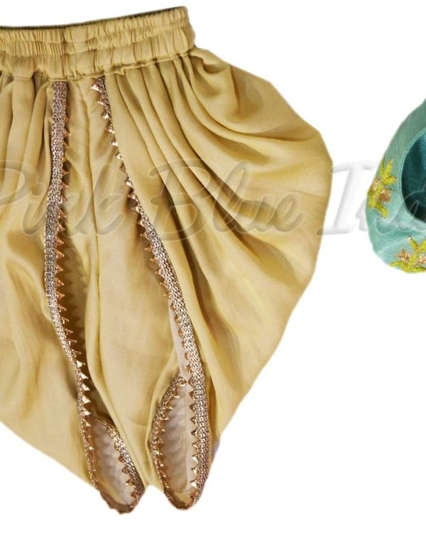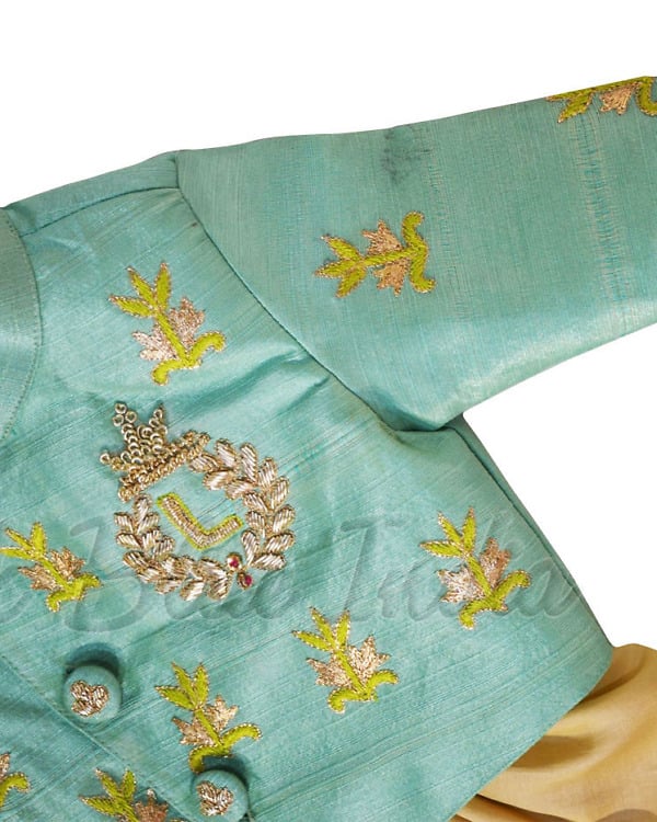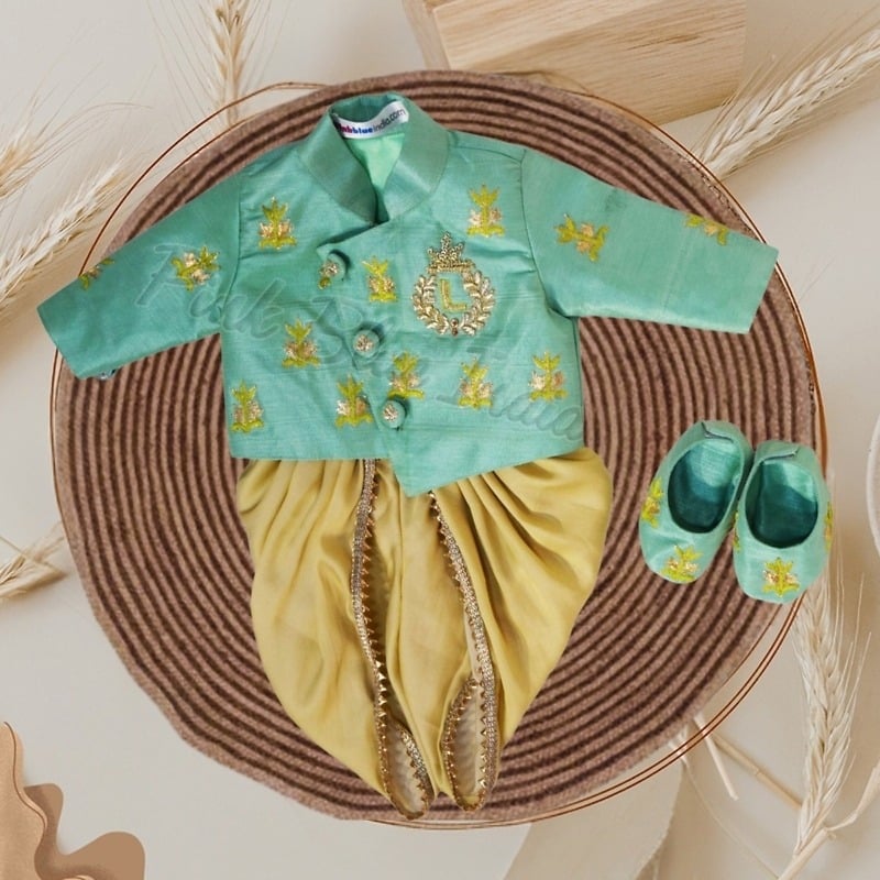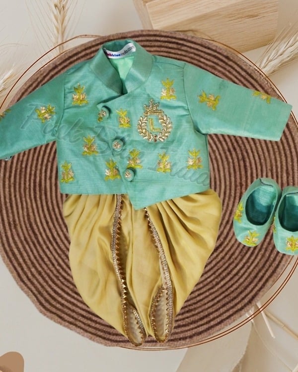 Dressed in this boys dhoti sherwani in green and beige, he is going to steal the show. Having intricate hand embroidery along with personalized name initials, this kids ethnic wear makes a superb kids sherwani for boys of age 0-6 months, 6-12 months and 1-12 years. Buy online this classy boys ethnic and party wear online that is curated using silk and also comes with matching shoes that can be created for boys of age up to 1 years.