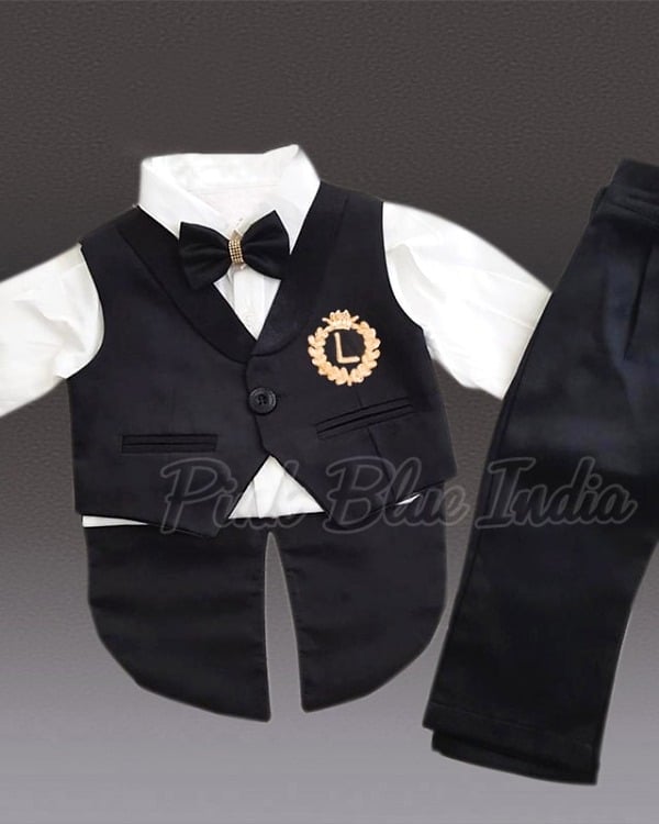 Be it a birthday party or a cradle or naming ceremony, you will have your little prince stand out in the fantastic tailcoat for boys. Shop online for weddings this season the classy tailcoat suit for kids in black and white. White cotton shirt with satin made black tail waistcoat and pants makes an awesome pick for boys between 0-3 months and 12 years of age. Custom and tailored tail coat set comes with a cute matching bow tie.