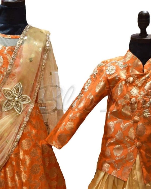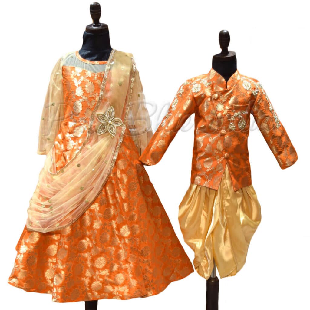 Twinning is fun and with orange and gold twinning dress for brother and sister is a perfect pick for birthday, Annaprashan, cradle ceremony and naming ceremony. Jacket and dhoti set for brother matched with gown with pre-stitched dupatta for sister make an incredible sibling dresses to buy online. This pair of sisters-brothers same clothes comes with intricate zardozi work on it. Go for the unique brother and sister ethnic wear to have your little babies between 0-3 months 12 years dressed in synch with each other.