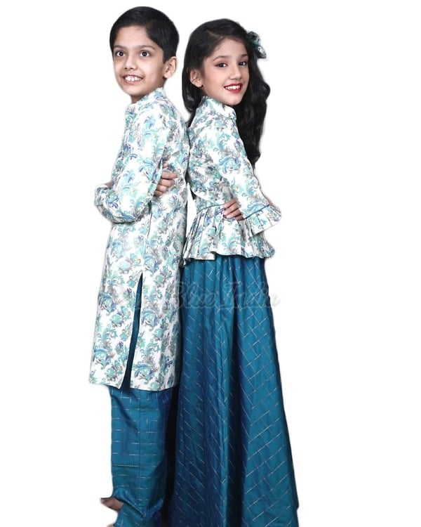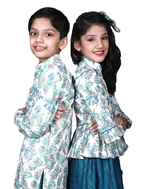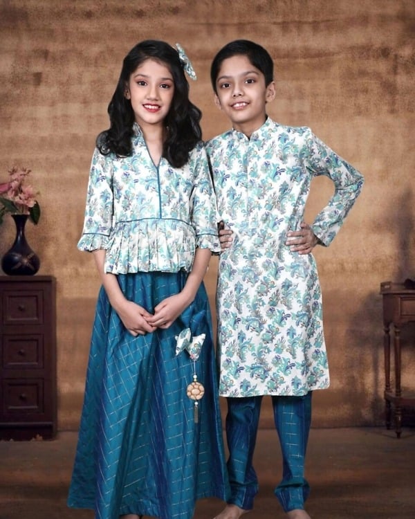 Be it a Rakhi or any other festive occasion with matching sibling wear made of cotton silk makes a delightful pick. Comprising of a peplum top with skirt for the sister and kurta pajama for brother, this siblings brother sister matching outfit makes a perfect pick. Shop online for this exclusive brother and sister matching outfit for weddings and festivals that comes in different sizes to fit your kids.