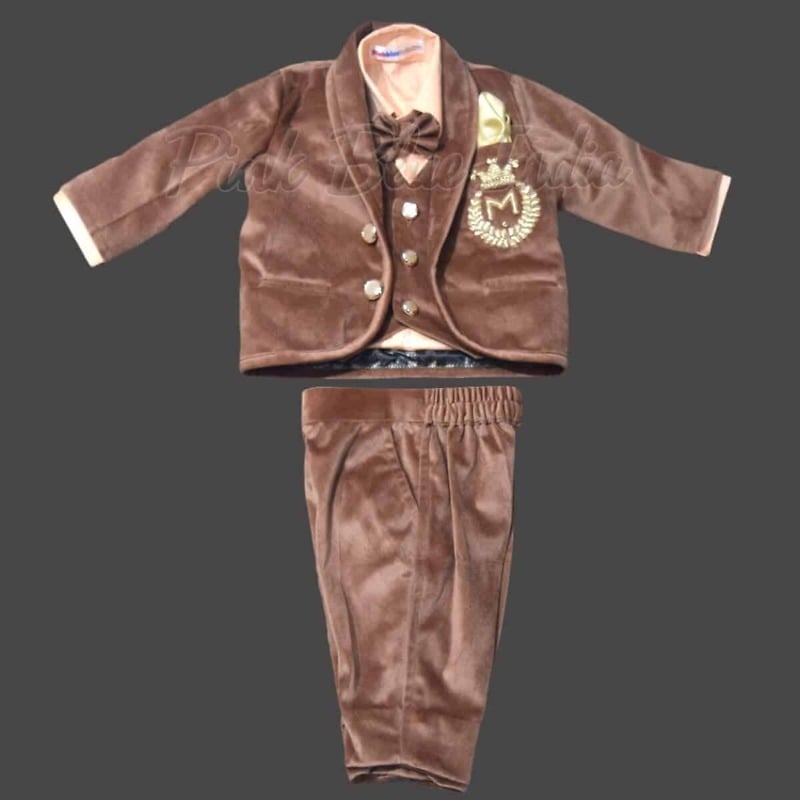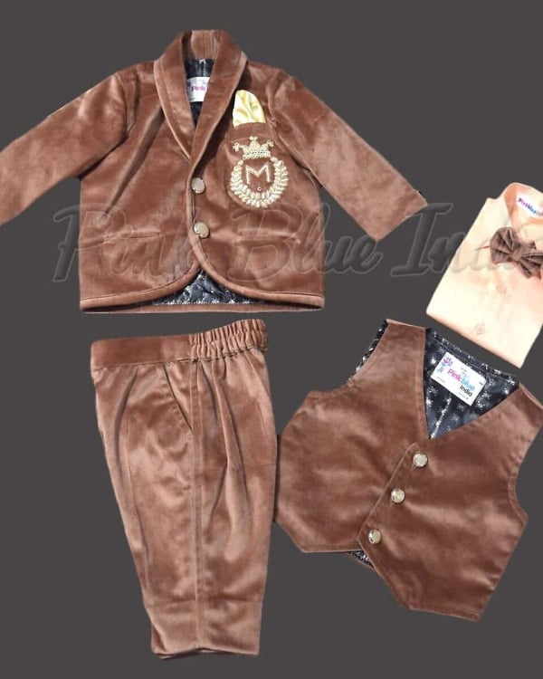 The five piece velvet coat suit set is just for you need for birthday or weddings to have your baby boy dressed in something truly formal. This brown colored suit comes with personalized name initials and includes a coat, waistcoat, pant, shirt and bowtie to make sure that your baby boy wears an impeccable look to every party this season.
