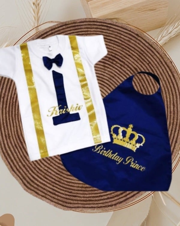 A lovely 1st birthday cake smash outfit for boys to dress your little kid like a prince in this royal blue and gold crown theme t-shirt and cape set. Custom birthday party t-shirt for baby boys with name and crown sticker and numeric “1” patched on it. Buy online in India this high quality t-shirt designed with soft cotton blend fabric and satin cape makes an adorable two piece set for photo shoot to click smashing pictures of birthday celebrations. Dress him stylishly in this Prince themed birthday outfit set which is too precious for his special day!!!