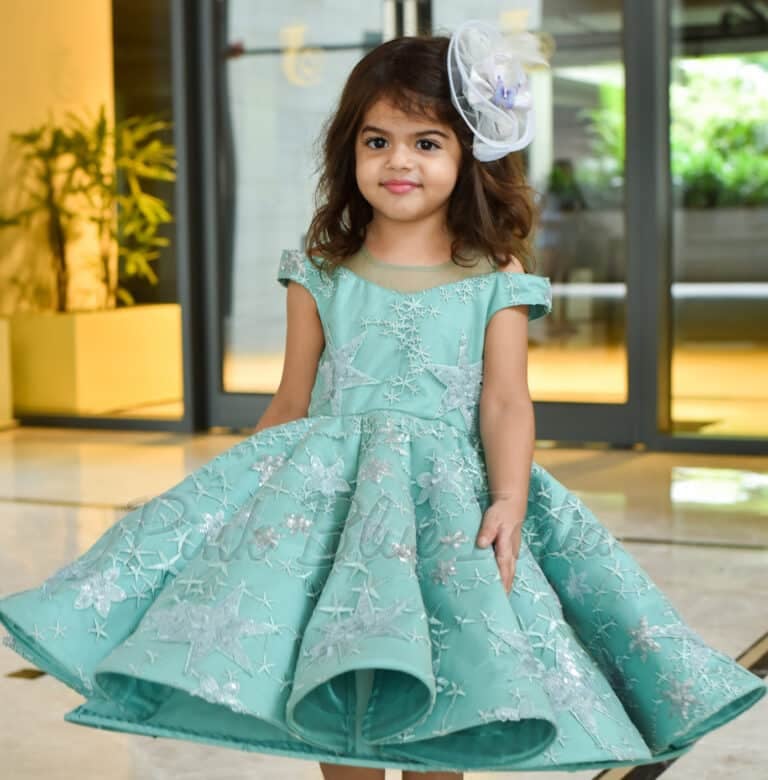 There is nothing classier than this gorgeous green colored paneled structured gown for baby girls of age 1-12 years. Shop online at Pink Blue India this fantastic custom made panel gown for birthdays, weddings and photoshoots. It comes with a beautiful star pattern along the gown and a stylish neck with net to add more glamour and grace to this exclusive designer outfit.