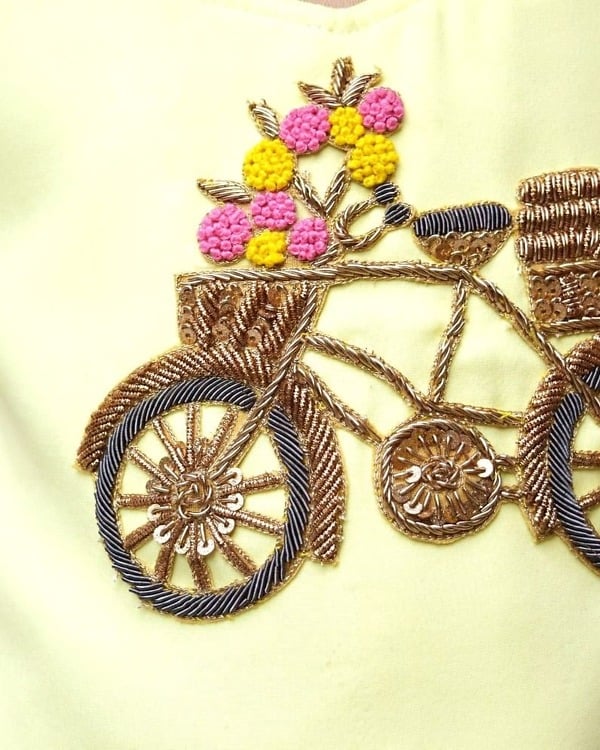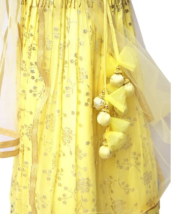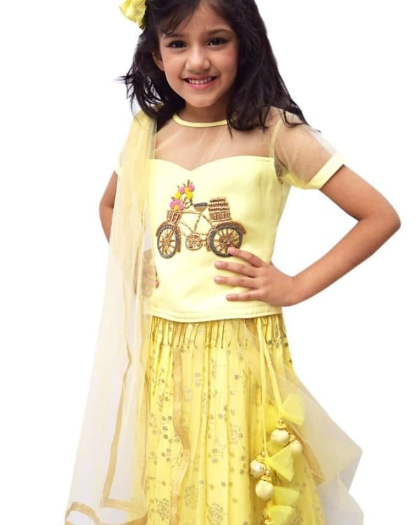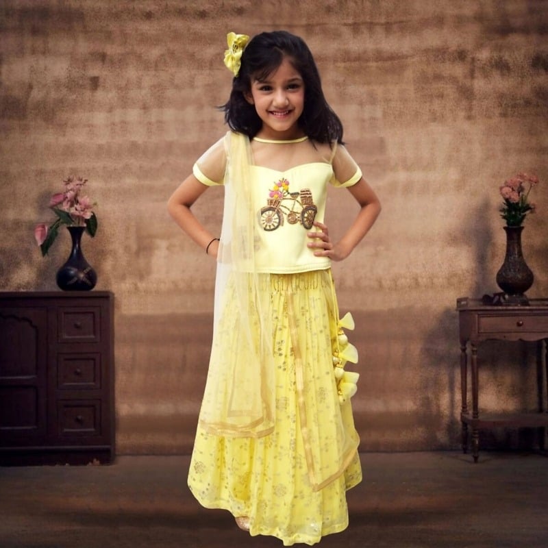 Capture her smiles in this bright and pretty lemony yellow coloured lehenga which comes with a top and dupatta. The top has intricate cycle embellishment making it a fun wear for carefree girls. The foil georgette lehenga has gorgeous handmade tassels crafted with love for your little one. There is a matching dupatta in net finished with golden borders. This is an adorable traditional wear designed for girls for weddings and festivals.