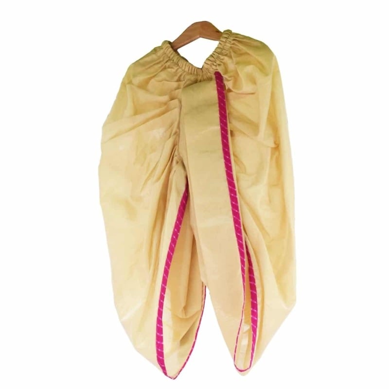 Have this posh piece of dhoti ordered online for your child from anywhere in India. This exclusive designer golden dhoti comes with pink leheriya finish on the ends which imparts it a perfect festive look. Dress your baby boy in this dhoti with matching kurta for an ideal outfit for festivals like Raksha Bandhan or Teej. This can also be customized for creating matching brother sister dress to wear on Rakhi this season.