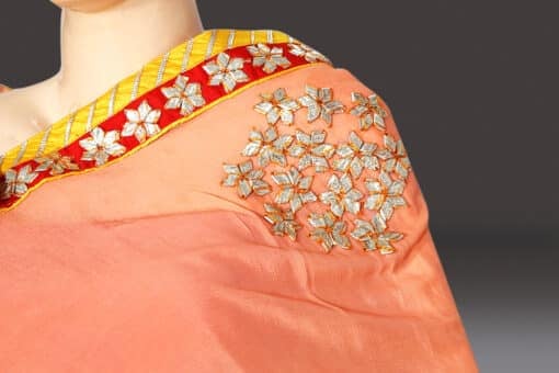 Wear this combination of peach color kachha gota work saree with contrast red blouse in this wedding season to look fabulous. You will look attractive and stunning for any wedding reception party. Look absolutely stunning in rajasthani gota patti sarees available from plain to designer range at low price.