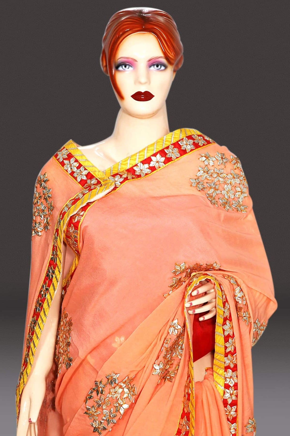 You can wear this beautiful Jaipuri Gota worksaree for any wedding parties, functions or traditional occasion. Buy this lovely tri-color saree to stock in your wardrobe for the wedding season. Drape this classy saree with trendy accessories to make the look more outstanding.