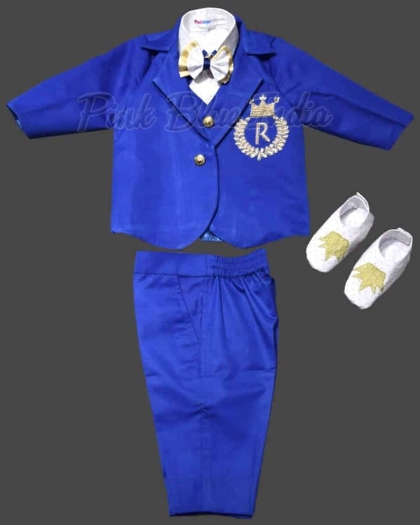 He is going to look nothing less than a price dressed in this blue colored 5 piece formal suit for baby boys with personalized name initials on the jacket. It comprises of a pair of pants, shirt, waistcoat, bowtie and blazer; this makes a complete ensemble to dress up baby boys for birthday parties, weddings and even photoshoots so that they always look the best. This combination comes with booties for babies up to 1 year of age.