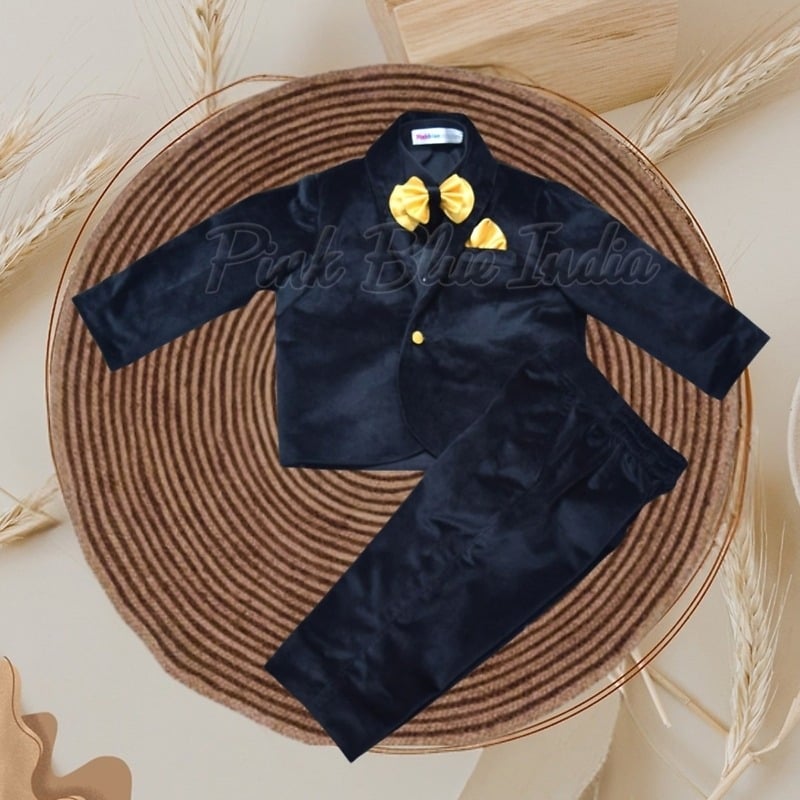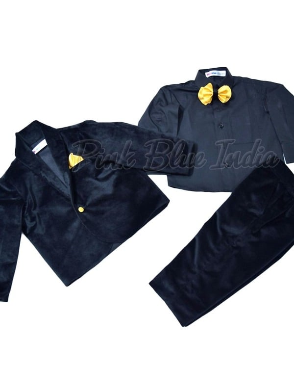 Dress your prince in this classy black colored velvet suit. It is a four piece party wear velvet suit for baby boys that comprises of a shirt, pant, coat and bowtie. Be it a birthday party or wedding celebration, this kids velvet suit and blazer outfit makes a delightful pick. If you are looking a ring bearer outfit the it makes a fantastic formal suit for boys of age 1 year, 2 year, 3 year, 5 year, 6 to 12 years of age.