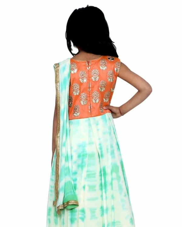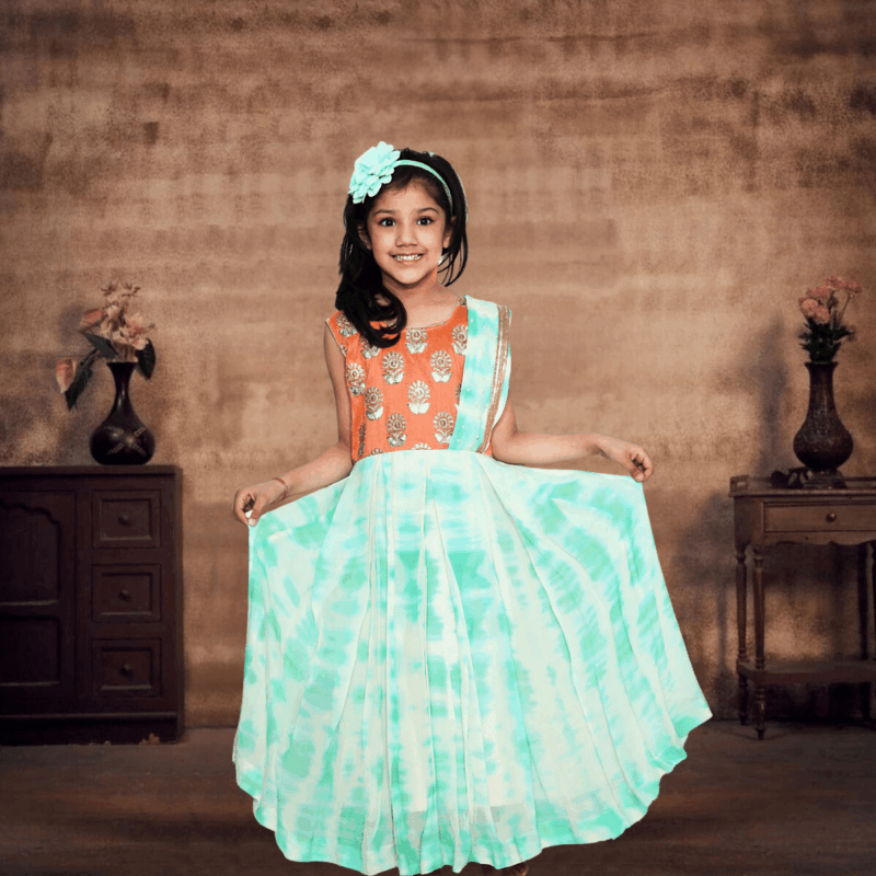 Unique Children Half Saree Style Gown for party in traditional shibori print. Baby saree style dress model with sleeveless orange bodice with floral design comes with a cream skirt with shibori print in green has been made with love using raw silk and georgette fabric. Complementing dupatta in cream and green is studded with white pearls making it a latest 2018 baby girl indo Western dress to shop online for engagement, weddings, reception and festive occasions. For baby girls, toddler and children up to 15 years.