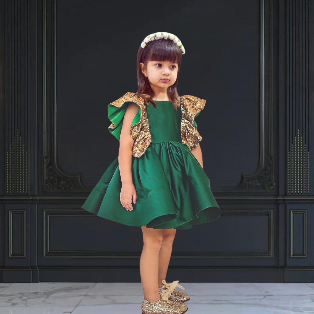 Dress her in unmatched style and glamour with the finest couture designer party dress. Emerald green coloured Tafeta party wear frock with sparkling golden sequinned ruffled sleeves comes with a big bow. This baby girl couture dress has been crafted using premium quality fabric for the classy look. She will look so graceful wearing this fashionable frock at birthday party, wedding receptions, and other special occasions. A wonderful work of art which comes for highly affordable price.