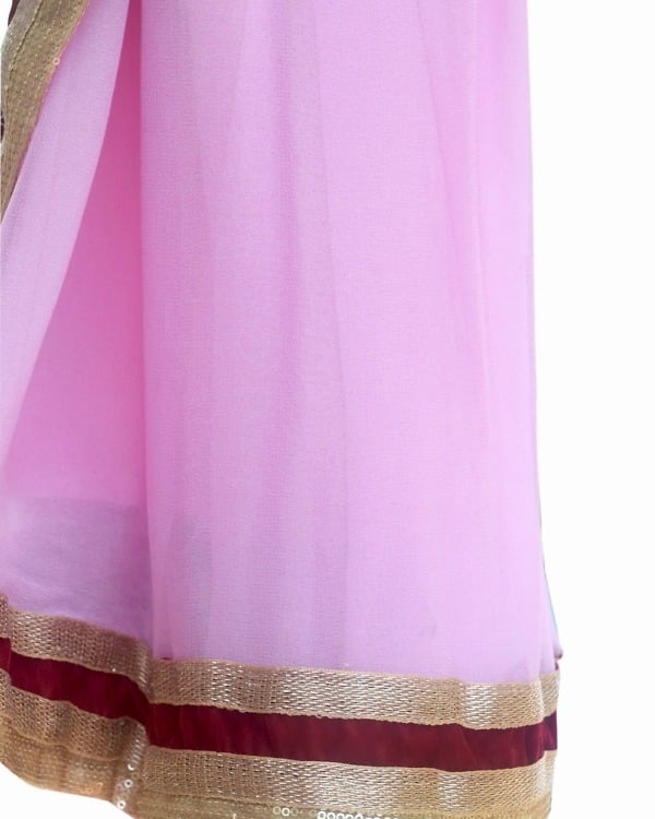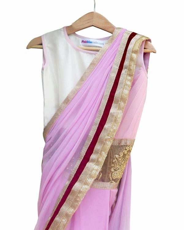 Dress your cute little princess in the gorgeous ready to wear saree style ethnic Indian clothing. This is a pre-stitched ready to wear georgette dress in baby pink with attached blouse with side zip closure. Buy online in India this designer partywear premium dress for your daughter for an elegant and classy look.