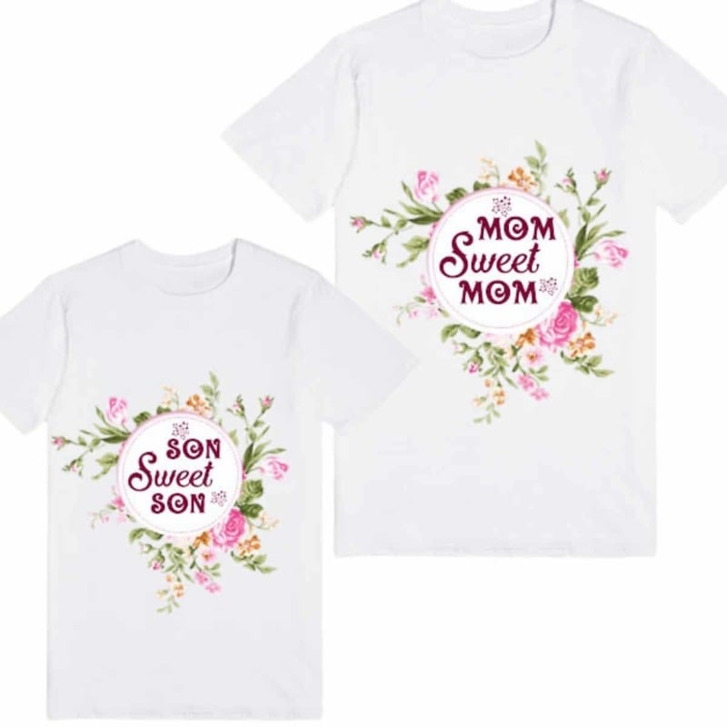 Personalized mom and son matching t shirt in white with floral print Sweet Mom and Son message printed on it. Dress in coordination with this wonderful family t-shirt that distinctively expresses the bond of love between a mother and her son. Whether it is a holiday or your son’s first birthday, customized mother and son matching t shirts make an awesome choice of clothing.