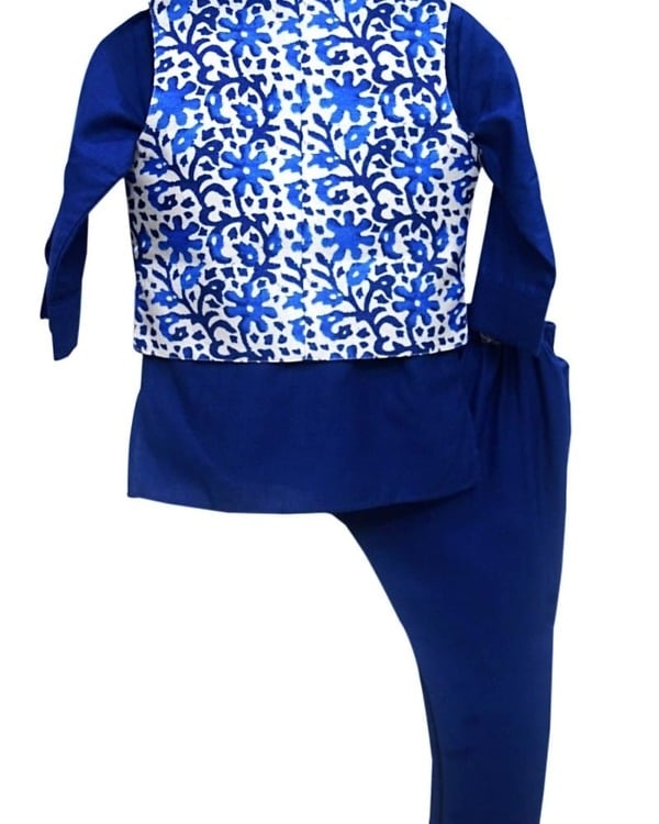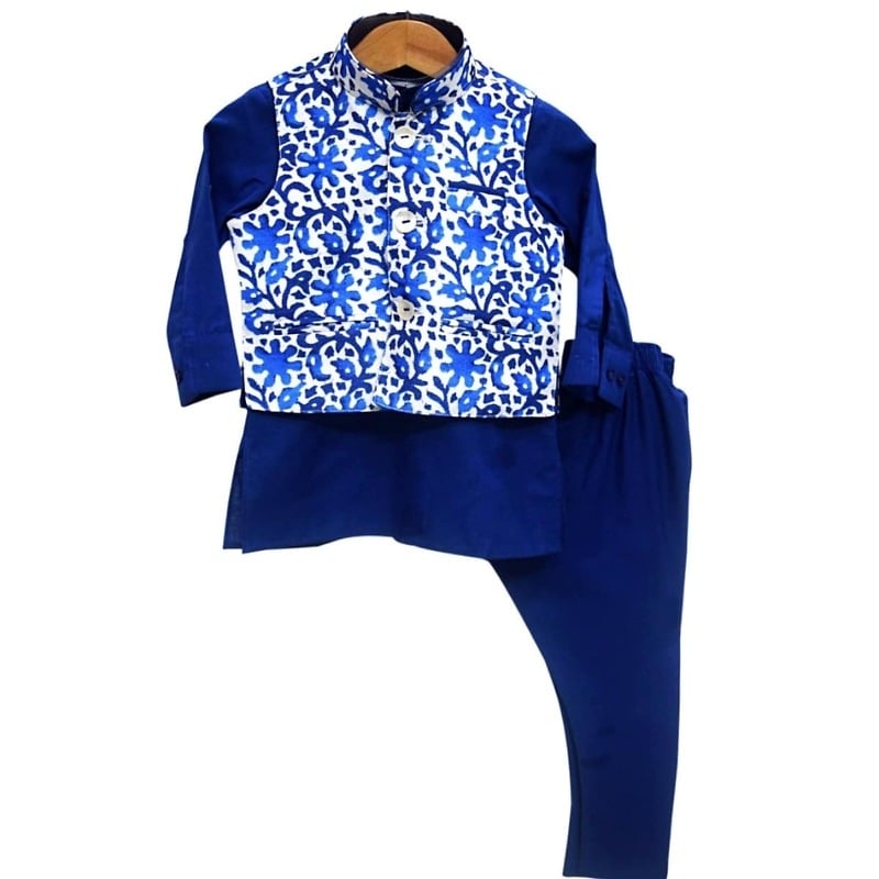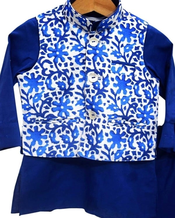 Newest and most stylish combination of blue Bagru print silk Nehru jacket which comes with solid blue coloured silk kurta and churidar pajama set for 1-2 year old boys make a delightful infant kurta pajama for wedding. A refreshing resplendent kurta pajama design to spruce up his look for Diwali, Eid, Raksha Bandhan is just a click away with this exclusive readymade traditional wear.