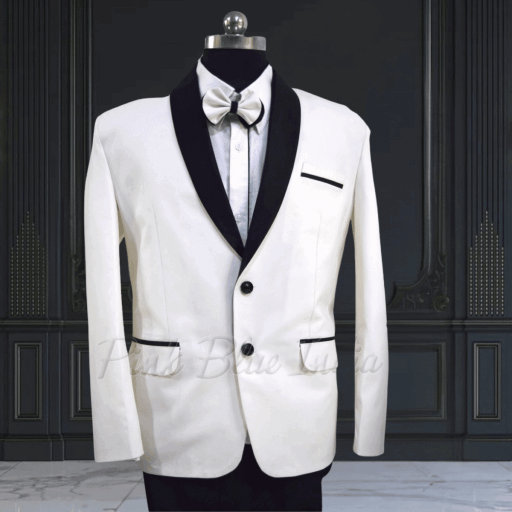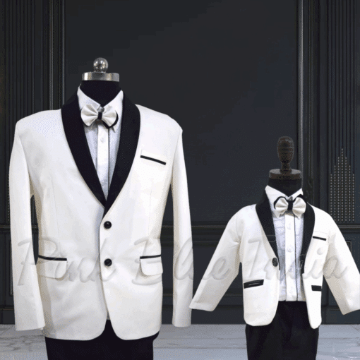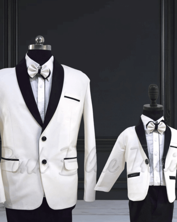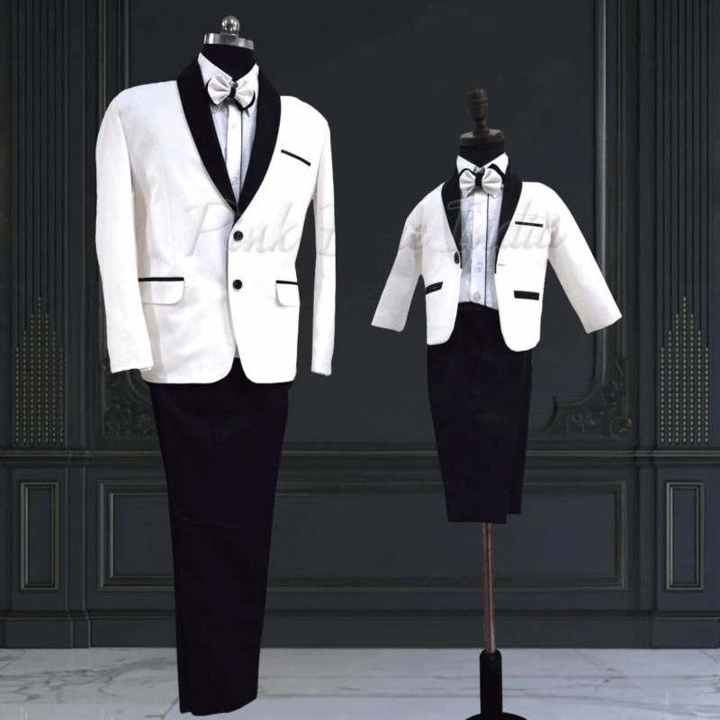 Twinning was never so much fun. This father son tuxedo in white color makes a perfect mantra to coordinate in the most dapper way possible. This father son classic tuxedo combo is designed using TR fabric and makes an awesome wear to weddings and birthday celebrations. This combination is matched to perfection to make sure that they look just alike dressed in this designer wear.