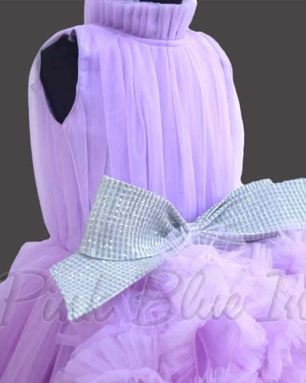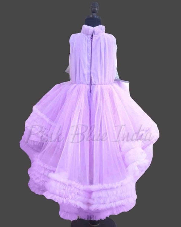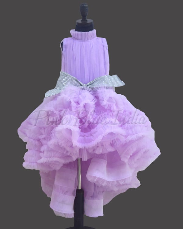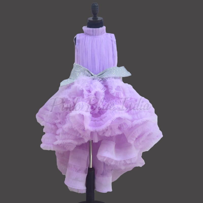 Buy online at PinkBlueIndia this amazingly pretty lavender colored ruffled tail gown that is designed using net fabric. This high low tail gown comes with a big bow in front with high neck sleeveless bodice. The matching headband with this dress makes sure that you don’t have to worry about dressing up the hair of your little princess. She is going to look gorgeous dressed in this ruffle evening gown for birthday and wedding celebrations.